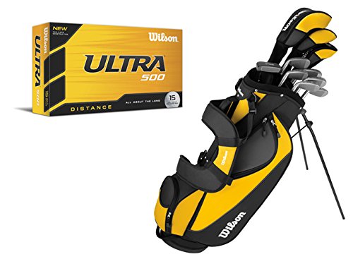 Package Includes: (1) Men's Wilson Ultra Golf Set - Right Hand (15) Wilson Ultra Golf Balls ---------- The Men's Wilson Ultra Golf Club Set includes the following. Matching Head Covers, Driver, Fairway Wood, # 4 Hybrid, (5 - PW) Irons, Putter, & Auto Deploy Kick-Stand Bag w/ Double Shoulder Strap! This set has everything needed to take your game to the next level! The large sweet-spot driver will provide plenty of distance off the tee, and the #4 hybrid eliminates the hassle of hitting long irons. The putter includes a steel shaft that produces consistent contact and feel, so you can finish the hole with confidence! Conquer the competition and purchase the Wilson Ultra Golf Club Set with VMInnovations! Also included in the package is the Wilson Ultra Golf Balls which will have you hitting long with its high energy core that generates maximum initial launch & ball roll in all conditions! It's a two-piece ball with an durable cut-proof cover that will help take your golf game to the next level. It will also help improve your short-game, as you can easily line up your putts with the "Ultra" logo on the seam! Complete Set Includes:\n\n We are an authorized Wilson dealer